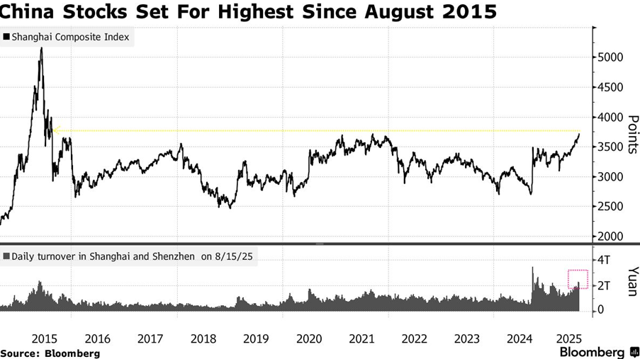 - The Shanghai Stock Exchange Composite Index jumped as much as 1.2% on Monday, putting it on course for its highest finish since August 2015.