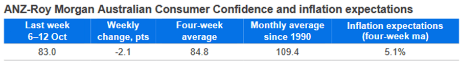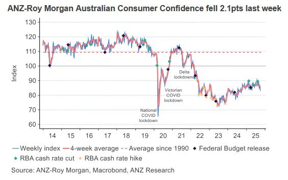 - Confidence dropped 2.1 percentage points to 83 points, dragging the four-week average to its lowest level since October 2024.