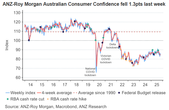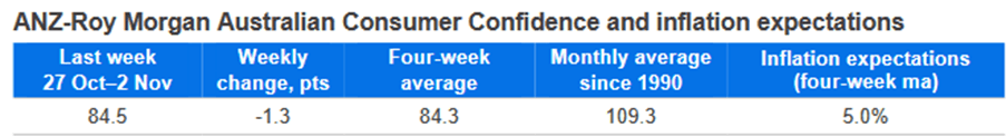 - Consumer confidence fell 1.3pts last week to 84.5pts. The four-week moving average ticked down 0.1pts to 84.3pts.
