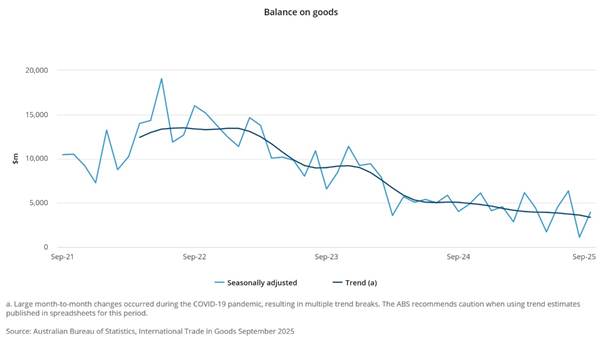 In corporate news, ZIP fell 4.2% after its AGM reaffirmed guidance — perhaps the market was looking for another upgrade. JHX tumbled again, down 12.7%, as it went into a trading halt and blamed index rebalancing for the earlier sell-off. TAH dropped 3.0% as Aware Super sold down, and AMC rallied 5.0% on first-quarter results. On the economic front, Balance of Payments data was released today, showing the seasonally adjusted balance on goods increased by $2.827bn in September.