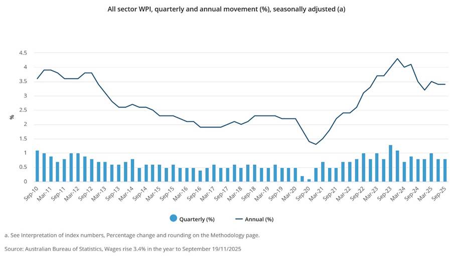 - Australian Wage Growth – The seasonally adjusted Wage Price Index (WPI) rose 0.8% this quarter. Annual wage growth to the September quarter 2025 was 3.4%. Annual wage growth remained steady compared to the June quarter 2025 but was slightly lower than this time last year.