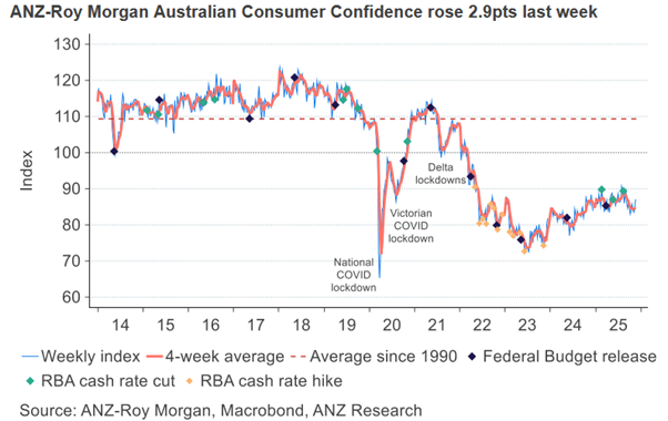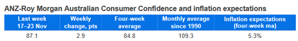 - ANZ-Roy Morgan consumer confidence rose 2.9 points last week to 87.1, its highest mark since early September.