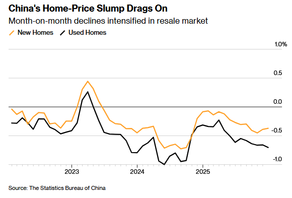 - China’s home prices fell in December, with new-home prices dropping 0.37% from November and resale home values sliding 0.7%.
