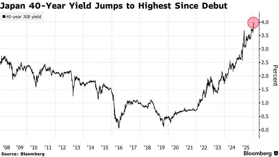 - Japan’s 40-year bond yield hit 4%, the highest since its debut in 2007 and a first for any maturity of the nation’s sovereign debt in more than three decades.