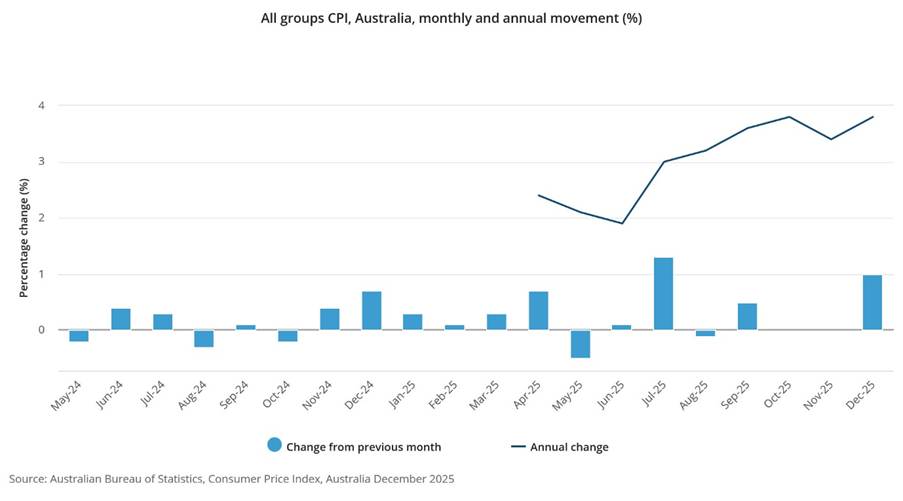 - The Consumer Price Index (CPI) rose 3.8% in the 12 months to December 2025, up from a 3.4% rise in the 12 months to November 2025. The largest contributors to annual inflation over the past 12 months were Housing (+5.5%), Food and non-alcoholic beverages (+3.4%), and Recreation and culture (+4.4%). In the month of December, the CPI rose 1.0% in original terms and rose 0.2% in seasonally adjusted terms.