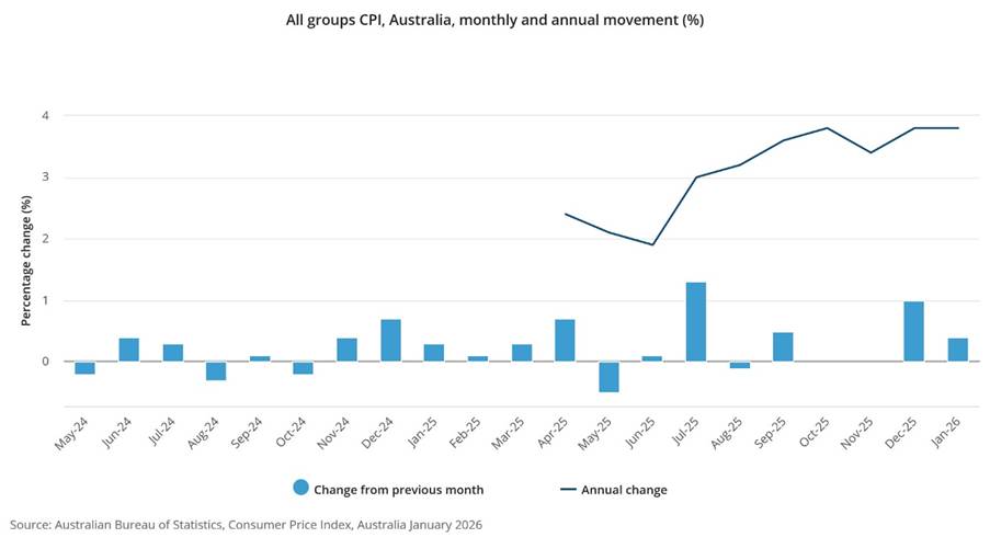 - Trimmed mean inflation was 3.4%, up from 3.3% in the 12 months to December 2025. RBA will remain under pressure on rate rises.