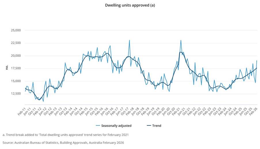 In economic news, dwelling approvals rose 29.7% in February to 19,022, driven by a surge in private apartments.